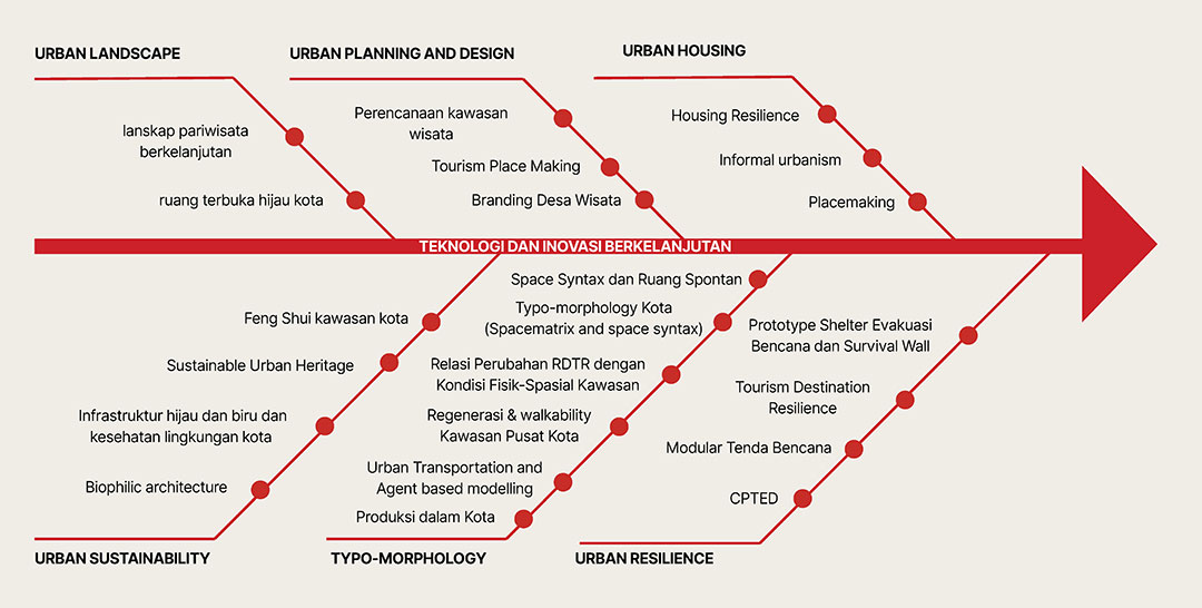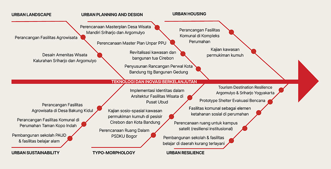 Kelompok Bidang Ilmu Arsitektur dan Urbanisme berfokus pada penelitian, pengembangan ilmu pengetahuan dan praktik perancangan arsitektur dalam konteks keterkaitannya dengan dinamika perkotaan, baik dalam skala tapak maupun skala kota.
