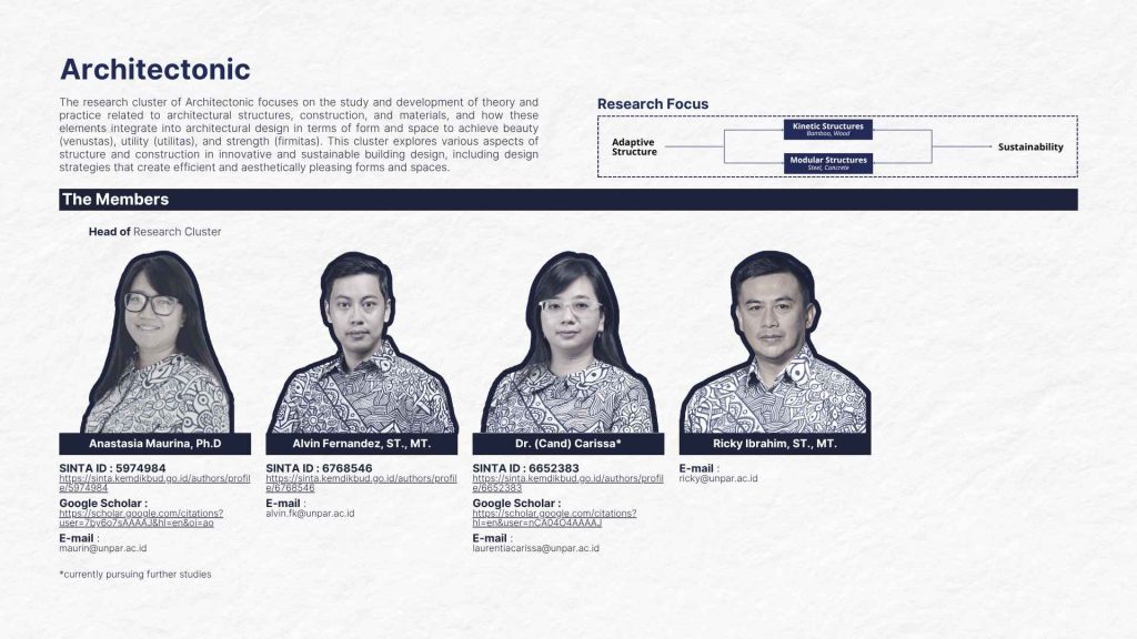 Dengan pendekatan lintas disiplin, KBI ini juga menjembatani antara teori dan praktik, serta terbuka pada inovasi teknologi seperti fabrikasi digital dan komputasi arsitektur untuk memperkaya eksplorasi arsitektonik kontemporer. Melalui penelitian, studio desain, dan pengabdian masyarakat, KBI Arsitektonik mendorong mahasiswa dan dosen untuk membentuk pemikiran arsitektural yang kritis, kreatif, dan kontributif terhadap tantangan zaman.